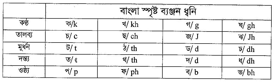 উল্লিখিত প্রক্রিয়ায় বাংলায় ২০টি ব্যঞ্জনধ্বনি উচ্চারিত হয়। অর্থাৎ বাংলায় স্পৃষ্ট ব্যঞ্জন ধ্বনির সংখ্যা হলো বিশ। নিচের তালিকায় তা দেখানো হলো-