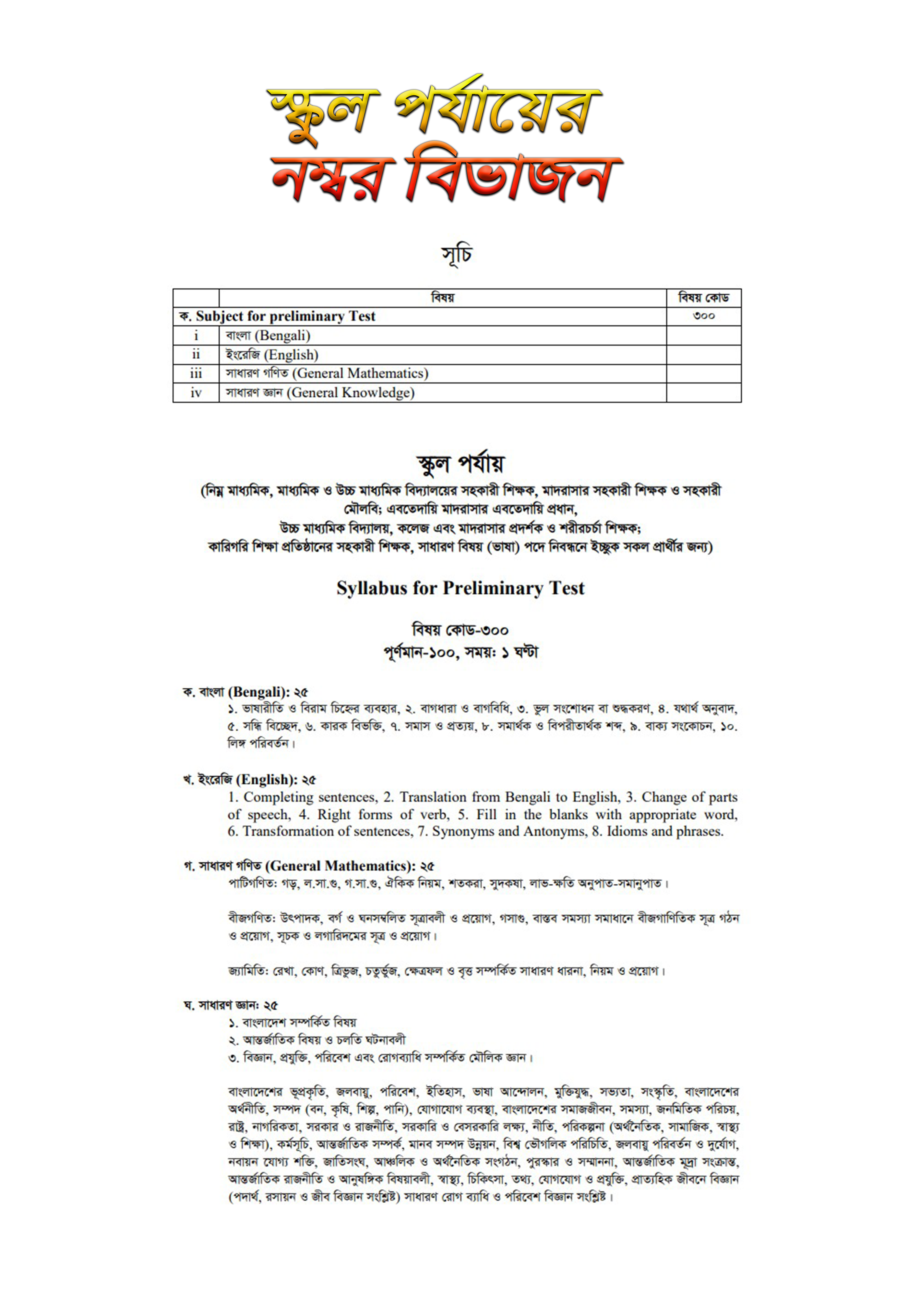 এই গণবিজ্ঞপ্তিতে স্কুল, মাদ্রাসা, ইবতেদায়ী ও কারিগরি পর্যায়ের প্রার্থীদের জন্য বিষয়ভিত্তিক নম্বর বিভাজন,