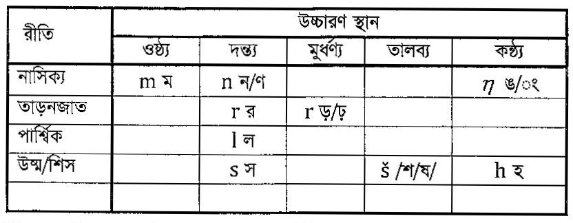 উচ্চারণ স্থান ও উচ্চারণ রীতি অনুযায়ী বাংলা নাসিক্য, তাড়নজাত, পার্শ্বিক ও উষ্ম/শিস ধ্বনি তালিকা নিচে দেওয়া হল-